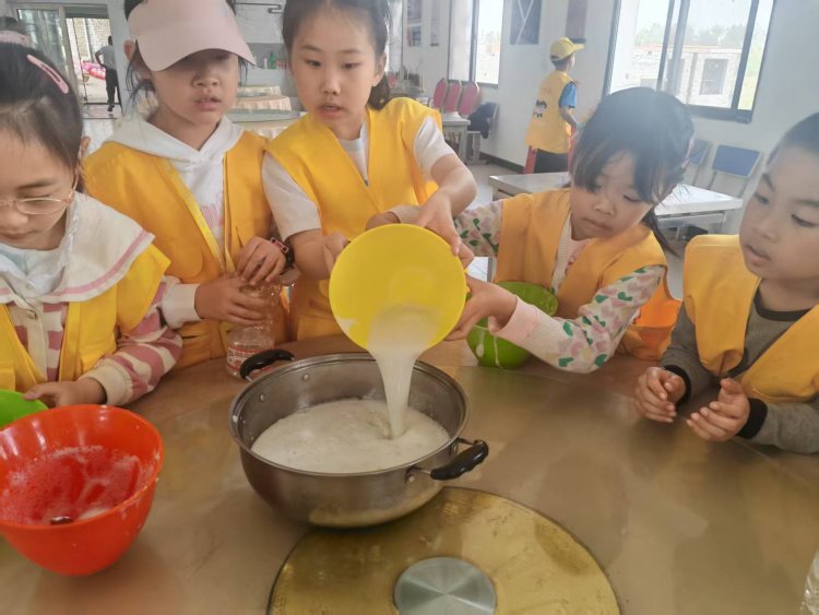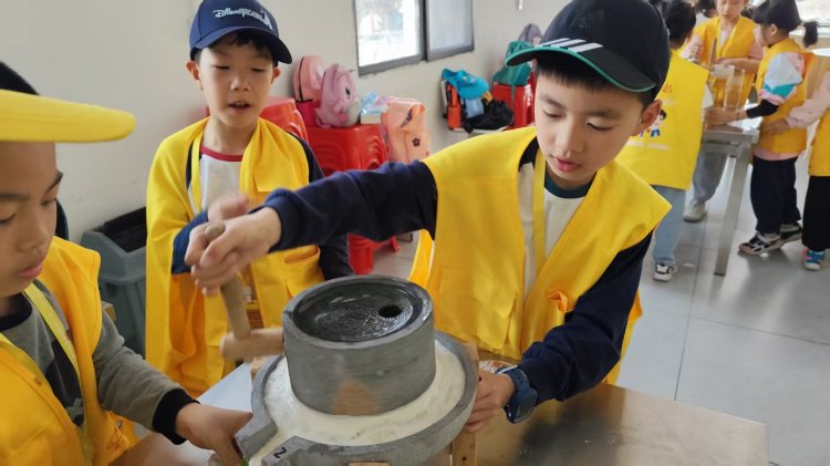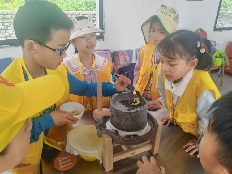 最热闹的场景总在青石磨盘前上演。“推磨要像小乌龟走路,慢慢来!”导师话音未落,几个急性子的小记者已握住磨柄,“一!二!”随着口号,磨盘开始笨拙地转动。“看!我的豆浆像下雨!”一个小男孩惊喜地指着磨眼滴落的乳白汁液。不一会儿,石磨四周便氤氲起奶白色的雾气,豆香裹着山风钻进鼻腔。当铁锅里豆浆翻滚如沸泉,孩子们围成一圈唱起自创的《石磨谣》:“转呀转,滴滴答,豆香飘进云朵家……”老师们将豆浆煮好舀进杯子里,小记者们品尝着自己的劳动成果,觉得格外的香甜。