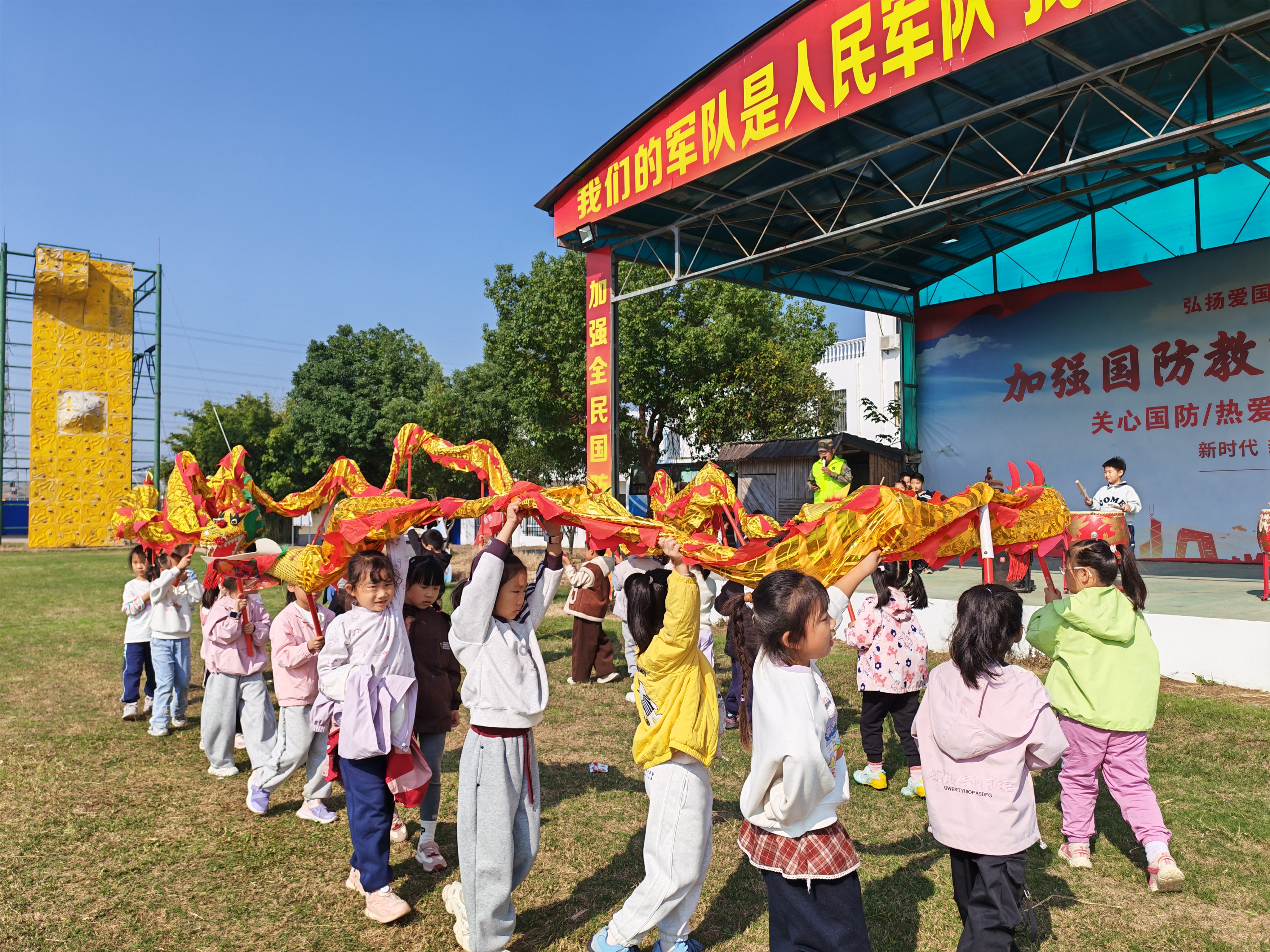 最受孩子们欢迎的,当属田野挖红薯与鼓槌舞龙活动。在红薯地里,孩子们手持小铲子,在老师的指导下,小心翼翼地拨开泥土,寻找埋在地下的红薯。“我挖到一个大红薯啦!”“快看,我的红薯长得像小拳头!”孩子们捧着自己的“战利品”,兴奋地向同伴展示。泥土沾满了小手和衣角,却丝毫挡不住他们的热情。挖红薯不仅让孩子们体验了农耕的乐趣,更让他们感受到了丰收的喜悦与劳动的价值。