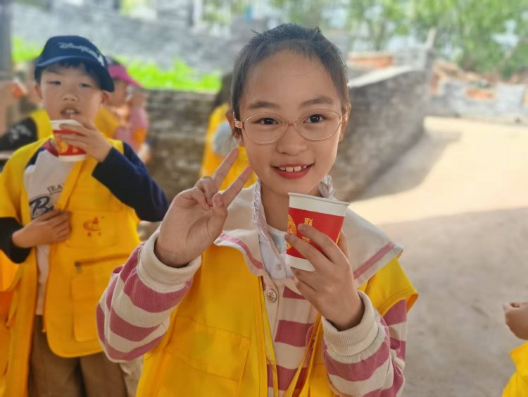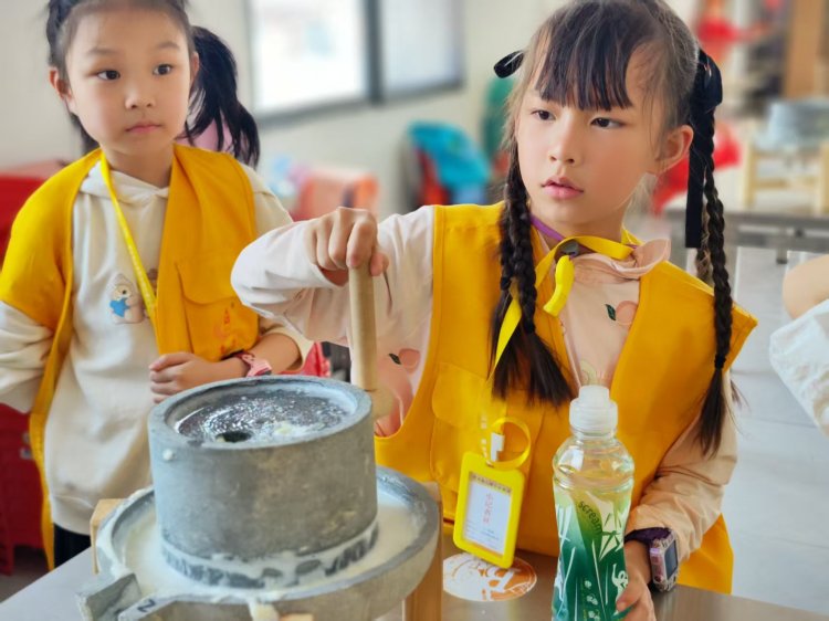 最热闹的场景总在青石磨盘前上演。“推磨要像小乌龟走路,慢慢来!”导师话音未落,几个急性子的小记者已握住磨柄,“一!二!”随着口号,磨盘开始笨拙地转动。“看!我的豆浆像下雨!”一个小男孩惊喜地指着磨眼滴落的乳白汁液。不一会儿,石磨四周便氤氲起奶白色的雾气,豆香裹着山风钻进鼻腔。当铁锅里豆浆翻滚如沸泉,孩子们围成一圈唱起自创的《石磨谣》:“转呀转,滴滴答,豆香飘进云朵家……”老师们将豆浆煮好舀进杯子里,小记者们品尝着自己的劳动成果,觉得格外的香甜。