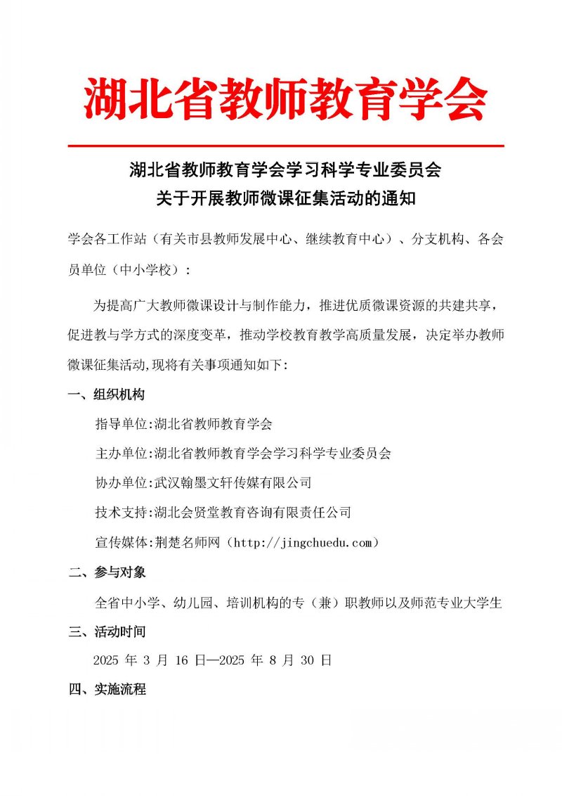 好消息!2025年度由湖北省教师教育学会学习科会专业委员会举办的“湖北省教师微课征集活动”正式拉开帷幕,湖北省教师教育学会已发布相关通知。与此同时,荆楚名师网重磅推出全新升级版教师微课制作技术培训课程,共64节课,内容涵盖全面且实操性强,助力教师提升微课制作能力。机会难得,欢迎广大教师踊跃报名参加大赛及培训课程!