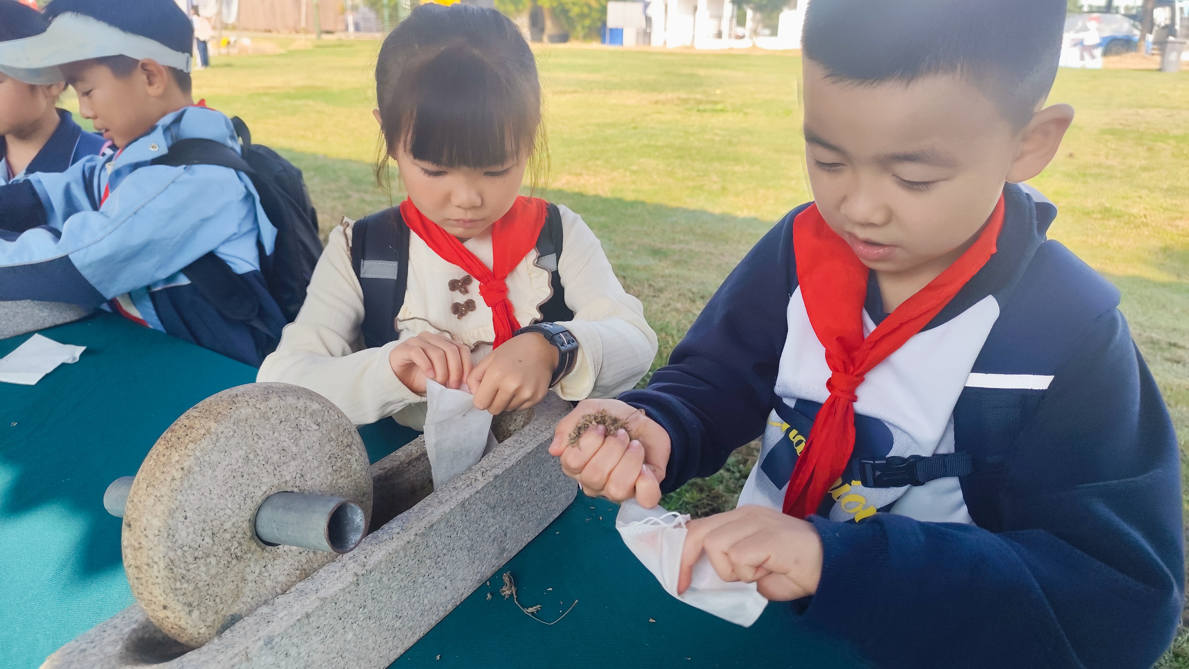在石磨体验区,孩子们争先恐后地尝试推磨。“哇,好沉啊!”两名同学合力推动磨盘,看着谷物在磨盘的转动下逐渐变成粉末,脸上满是成就感。“原来我们吃的粮食,是古人用这么辛苦的方式加工出来的!”有的同学感慨道。通过亲手操作与老师的讲解,孩子们深刻体会到了“一粥一饭,当思来处不易”的道理,也对农耕文化中蕴含的勤劳、质朴精神有了更直观的理解。